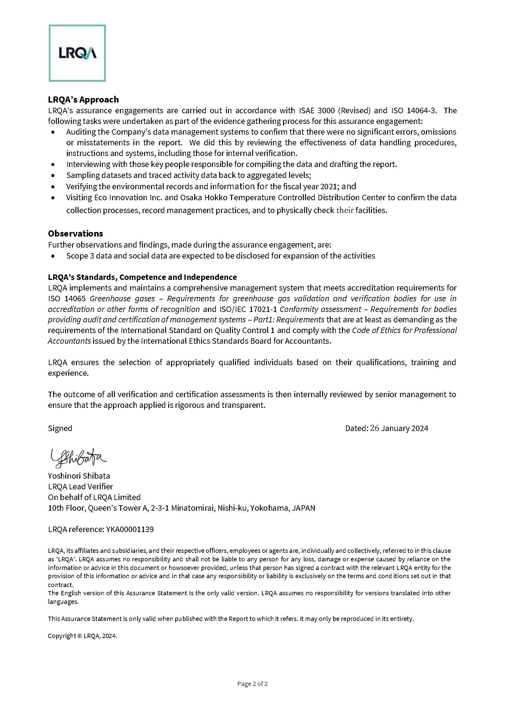 The KONOIKE Group has obtained third-party assurance for our GHG emissions in FY3/2024 (Scope 1, Scope 2, and Scope 3 Categories 1, 2, 3, 5, 6, 7, 11, and 12*), total energy input, and total in-house solar power generation*. This assurance was conducted by LRQA Limited, based on ISO 14064-3:2019 (GHG) and the revised ISAE3000 (non-GHG). We will continue to ensure the reliability of our calculations by obtaining third-party assurance and expanding the scope of our guarantees.